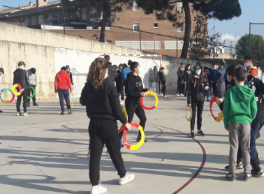 Esbarjo: Hi ha un pati amb: Pistes per fer els esports que més t’agradin, la cantina per comprar-te l’esmorzar, la biblioteca per llegir, fer deures, també hi ha un gimnàs…
